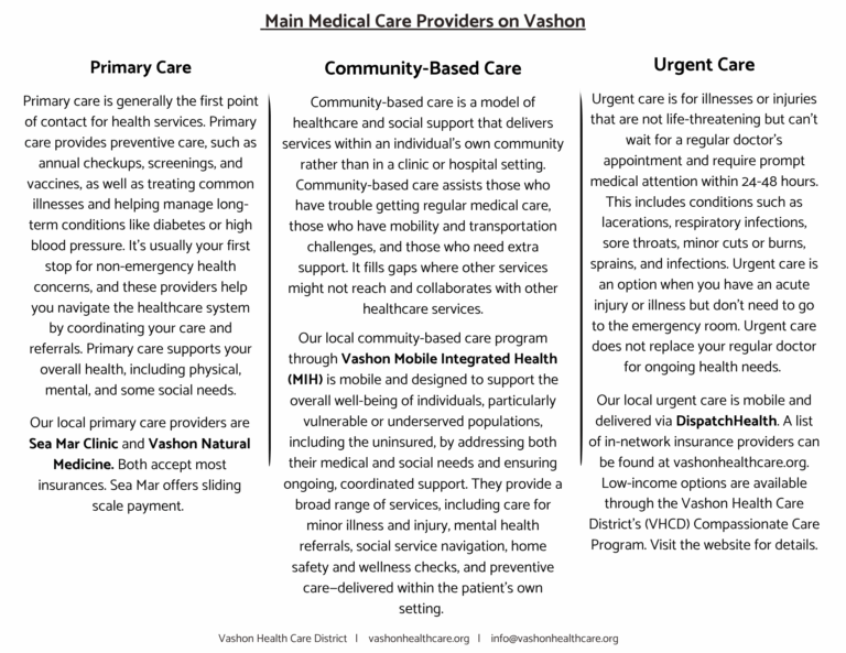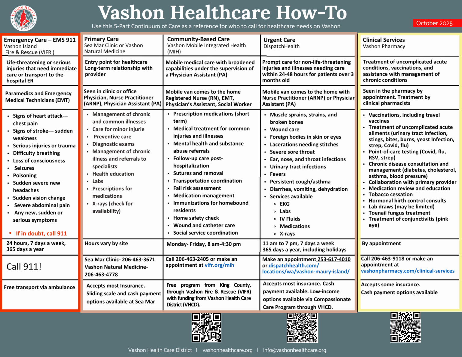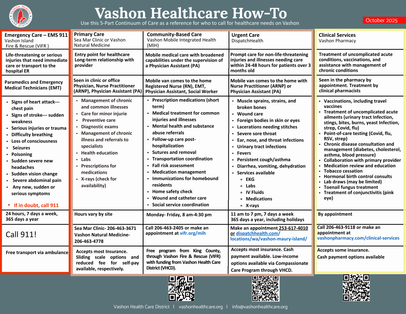 With the addition of another on-island medical health resource, now is a good time to outline the scope of the main medical entities on island, primary care, urgent care, and the new community-based care model, Vashon Mobile Integrated Health. This information can be clicked to enlarge and/or printed from this newsletter for future use.